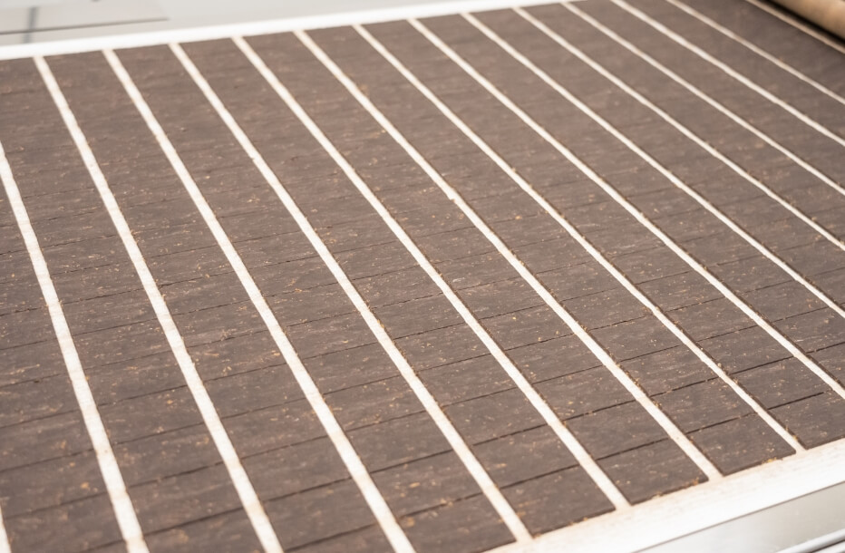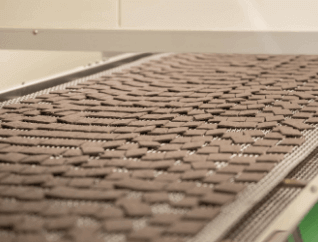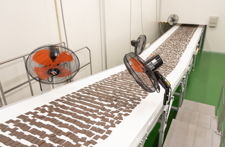 成型された生地は、約50mの長いオーブンの中をベルトに乗せられ、5分から10分くらいかけて、おいしいビスケットに焼きあがります。そのあと、ゆっくり自然に冷まします。きびしい検査もあります。
