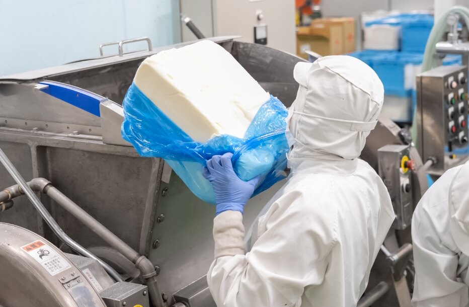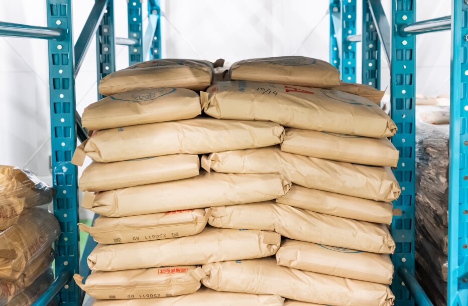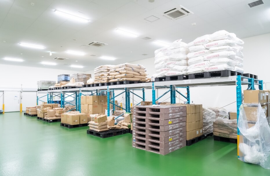 ビスケットを作るのに必要な、砂糖、油脂、乳製品などが運び込まれて来ます。たくさんある原材料は工場内へ持ち込みやすいように、きれいに整頓して保管しています。小麦粉はサイロに送り込まれます。
