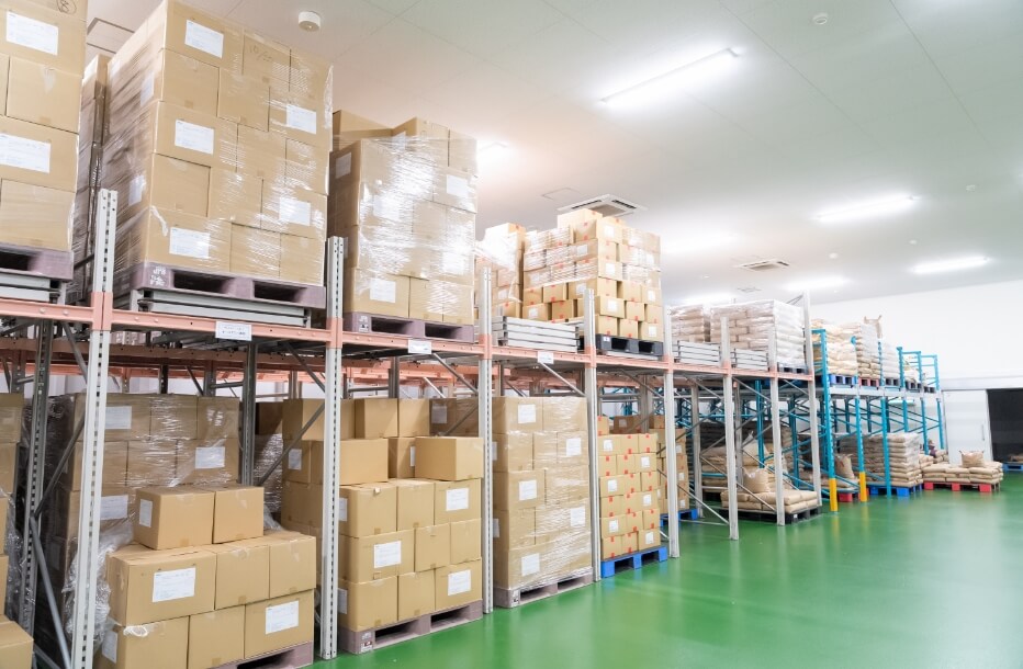 ダンボールケースに詰められた色々な種類のビスケットが管理されています。小売店や問屋さんからの注文の通り、トラックへ積み込み、全国へ配送されています。